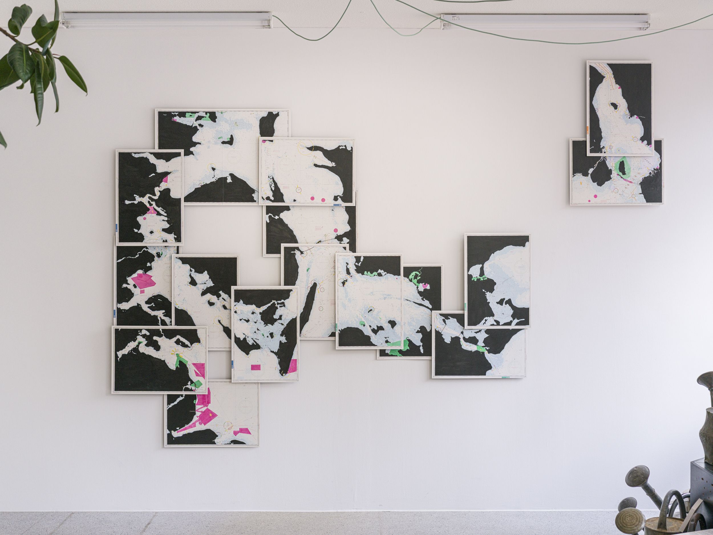 Karten versammeln auf komplexe Weise Wissen, das sich der Mensch angeeignet hat, um sich zu verorten. Dieses, im grafischen Gefüge der Karten enthaltene, aber nicht immer leicht dechiffrierbare Wissen, macht die Künstlerin sichtbar. In der Arbeit, die für das Gießkannenmuseum entstanden ist, sind es Naturschutzgebiete (grün) und Gefahrenstellen wie Sperrgebiete (pink), die die Künstlerin mit farbiger Tusche heraushebt. So verweist ihr gestalteter Kartenraum „auf das fragile Verhältnis zwischen Schutz und Nutzung“ und macht „die Aushandlung zwischen natürlicher Dynamik und menschlichen Eingriffen“ sichtbar, so beschreibt es die Künstlerin.