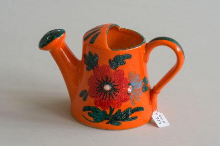 Am 1. August 2014 überraschte der Stifter das GiKaMu mit einer Großlieferung von 18 Messing- und Kupferkännchen sowie 14 Keramik-Gießkannen. Das Sammelsurium stammt aus dem Nachlass der Mutter, die in Gießen beheimatet und Anfang des Jahres verstorben war. Ihr Sohn, der sowohl in Kassel als auch in den USA lebt, hatte mit Bedacht die geerbten Bewässerungshelferinnen bei der Haushaltsauflösung für das Museum zur Seite gestellt. Dabei löste er die Gießgefäße aus einem Sammelkontext, in dem auch Tischbesen, Samoware und Teekessel zu finden waren. Dieses Exemplar ist eins der Fundstücke.