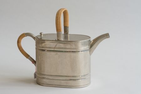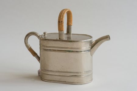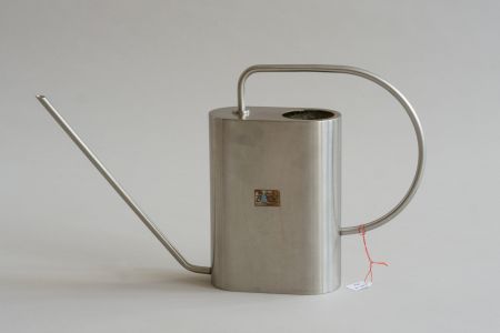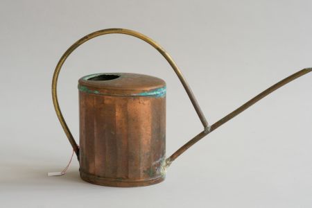 Blech, weiß lackiert, englische Form, mit eingestanztem Blumendekor, zwei Henkel, davon einer klappbar, Spreize, feste Brause, stellenweise Farbabblätterungen, Gebrauchsspuren